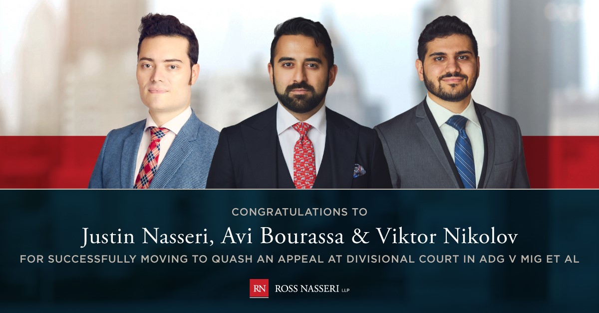 Justin Nasseri, Avi Bourassa, and Viktor Nikolov successfully move before the Divisional Court to quash an appeal from an injunction they obtained in The Morgan Investments Group Inc. v. Adi Development Group Inc. et al.