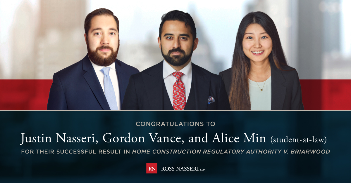 The Home Construction Regulatory Authority charged our four developer clients from the Briarwood developer family, Briarwood Estates (Sutton) Inc, 2401886 Ontario Ltd, 863195 Ontario Ltd., and Briarwood (Angus) Ltd. with 142 counts of misconduct under section 3 of the Code of Ethics to the New Home Construction Licensing Act, 2017. The financial penalties sought amounted to approximately $33M, placing our clients’ futures and livelihoods at stake, in addition to their reputations and abilities to be licensed.