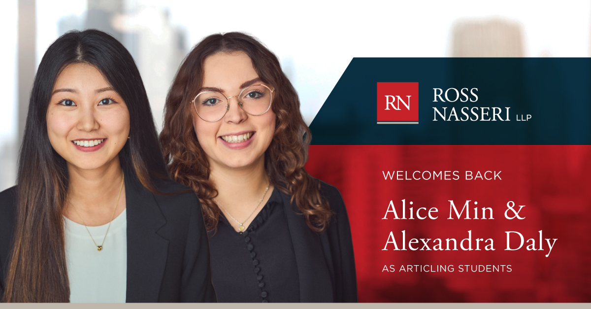 Ross Nasseri welcomes Alexandra Daly and Alice Min back to the firm as articling students. Both Alex and Alice joined Ross Nasseri as summer students in 2024 prior to completing their third year of law school.